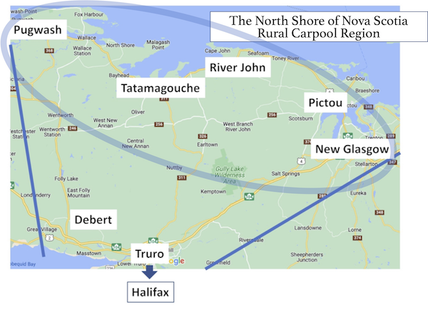 I tried varieties of promotions, and standard approaches, with limited success. Then, after many in-depth discussions with many of those enthusiastic sign-up-ers, a picture emerged about community, about potentially traveling with "strangers," and about uncertainty and convenience. After pondering further a lot of things about rural issues, I decided the project needed to evolve, to find its best niche in the rural ecosystem. It needed to grow, but smaller. What emerged was the "Commons Community" -- an online site focused exclusively on a small microregion: a town like Tatamagouche, with its nearby hamlets and crossroads and clusters of homes (see right). Under 3,000 people. We share grocery stores and a farmer market, and a post office and (in our case) a hockey rink and some churches and a stage and pizza and restaurants and a brewery, and lots more. What we no longer share, however, is easily accessed community information. There is no local newspaper, no phone books, no local Yellow pages -- there's hardly even bulletin boards anymore. "Use the Internet," they say, but the Internet leaves out a lot of rural realities. The Commons is designed as a platform to change that, to help members of a small rural community self-organize: to share information in the Classifieds, to promote our local businesses, our community events, garage sales, Saturday tables at the Farmer's Market, school plays, band practice... and freecycle, and share resources, and give away stuff to our neighbors, and plan impromptu Potluck Picnics at a local park. And to plan Carpools for scheduled travel to larger towns. Who knows what community creativity might produce? As of February 2024, three* very different communities are piloting the Commons project in their towns: